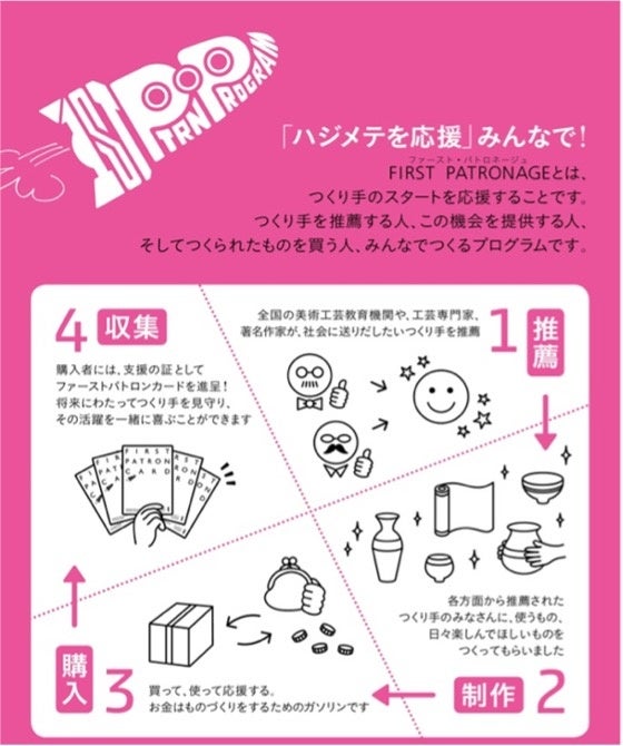 各方面から推薦され選考された作家が出品し、作品販売を行います。本プログラムでは、作品購入ごとに特別な応援者の証「ファースト・パトロン・カード」が渡されます。カードにはつくり手からの御礼のコメントが記載され、つくり手と応援者が末永く関係出来るよう後押しをします。また、カードが多く貯まっていくことで、応援者の更なる応援の気持ちを育みます。