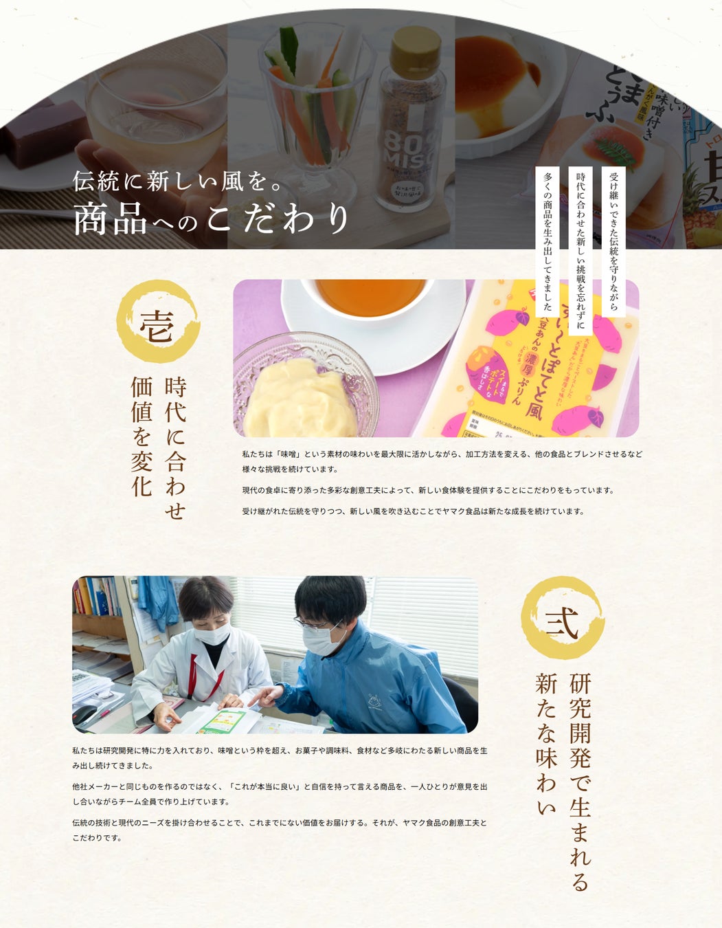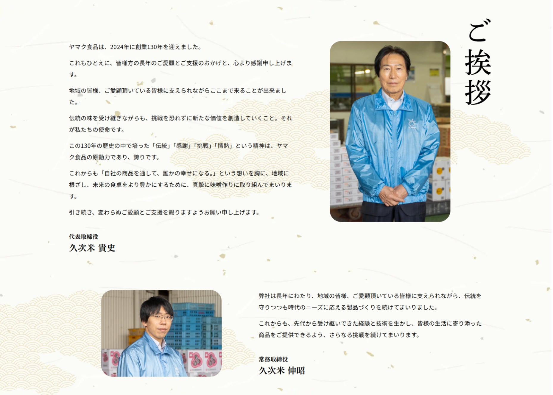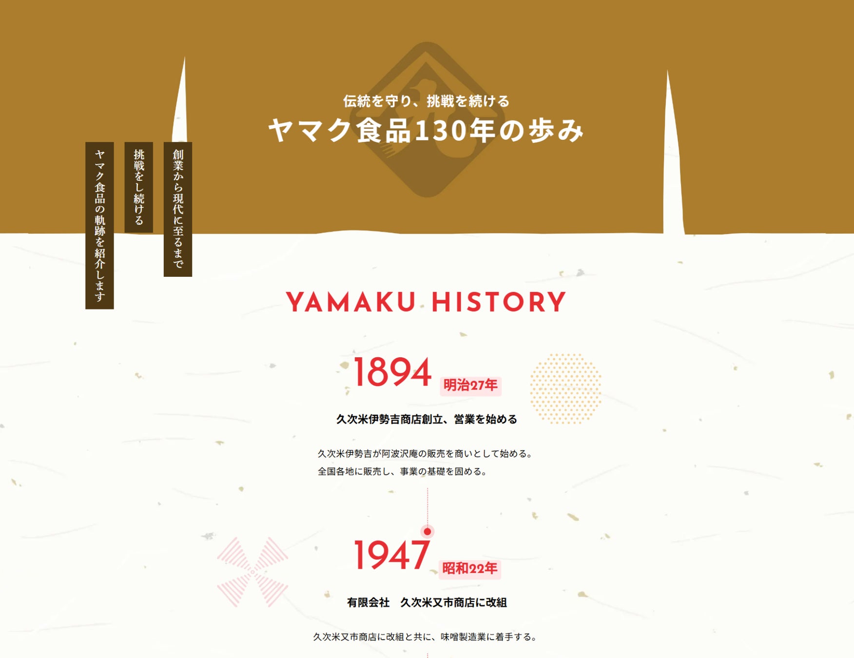 創業130周年を記念として作成したブランドサイトでは、創業から現在に続くヤマク食品の歴史、経営者からのメッセージ、商品作りへのこだわりがご覧いただけます。この先30年、50年、100年と伝統を守りながらも、新しい味噌文化の創造に挑戦してまいります。そしてより一層、地域の発展、食文化の発展に貢献し、この先も皆様に愛される企業を目指してまいります。