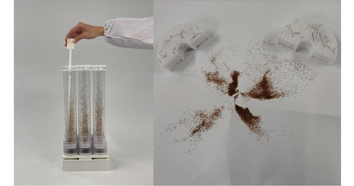 このキットには、種子採取の利便性を向上させるため、ミニコンテナ(アクリルパイプ)から植物を出さずに種子採取ができるような「シードロッド(種のはたき棒)」と、3次元網目構造(ジャイロイド構造)で種子以外のごみを絡めとる「シードフィルター」が付属しています(写真参照)。これらの器具により、遺伝子組換え植物を栽培した場合でも、種子などが飛び散って拡散される事故を防ぐことが可能です。