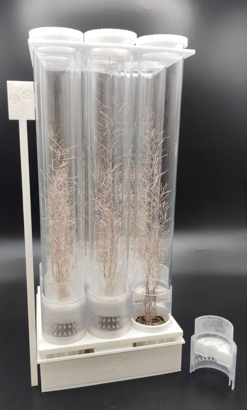 本シリーズの2つ目の特徴は、狭い空間でも配置できるように、18㎝×18cmサイズのコンパクトサイズのコンテナ容器として規格化していることです。本シリーズのミニコンテナは、18cm×18cmのトレイに直径約3cmのポット(鉢植え)が9個並ぶようになっています。各ポットは、透明なアクリルパイプなどのプラスチック器具を用いて密閉されております。また、9個のポットを合わせて一つのトレイに一体化できるため、持ち運びが可能なコンテナとして機能します。なお、トレイやポットなど土と直接触れる部分は、使い捨て器具として想定されており、オートクレーブ(加圧)不活化処理後に土と共に捨てると、そのまま自然分解する生分解性素材(PLA:ポリ乳酸)で製造されております。