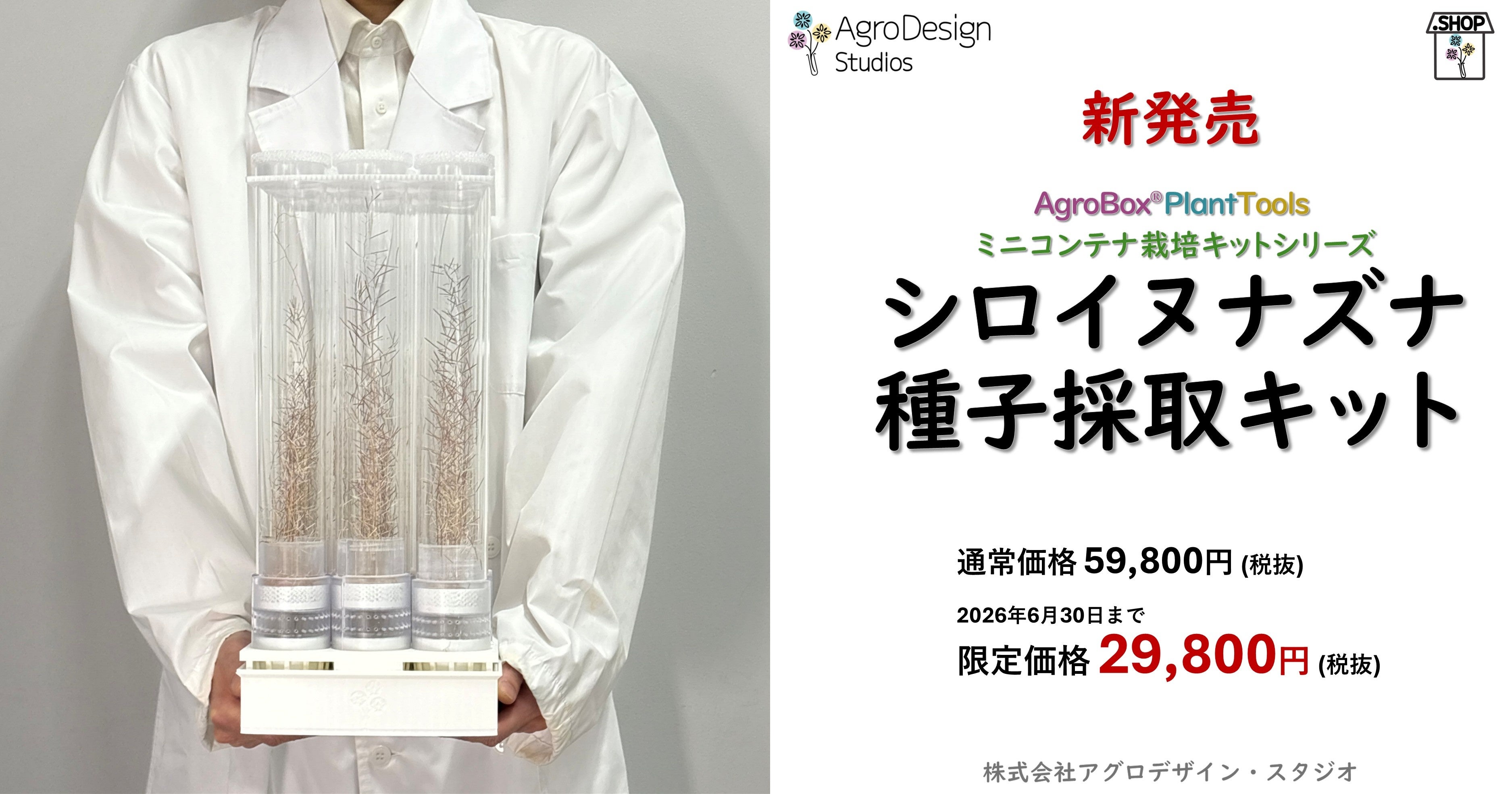 アグリテック系スタートアップの株式会社アグロデザイン・スタジオ(本社:千葉県柏市、代表取締役社長:西ヶ谷有輝、以下アグロデザイン)は、植物工場や実験室内における遺伝子組換え作物やゲノム編集作物の栽培に最適な局所密閉タイプの栽培容器である『AgroBox® PlantTools ミニコンテナ栽培キットシリーズ』を開発しました。今回、シリーズ第一弾としてシロイヌナズナ種子採取キット」を発売いたします。本製品は、植物科学の実験に欠かせないモデル植物であるシロイヌナズナ(Arabidopsis thaliana)の栽培と種子採取をコンパクトな密閉容器の中で行うことを可能にしました。