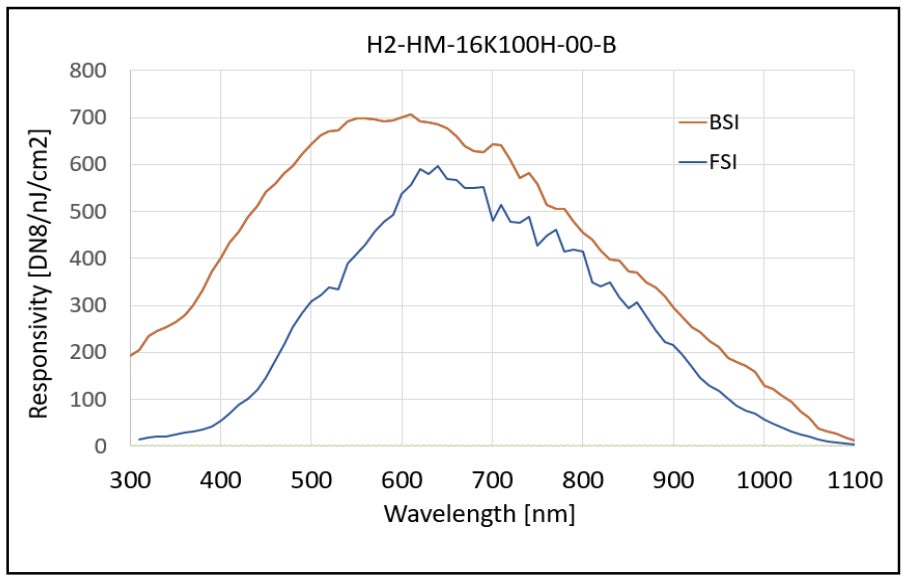 また、通常のTDIセンサ (グラフ内 青線)と比較してBSIセンサ(グラフ内 オレンジ線)は全体的に感度の上昇が見られ、特に350nm付近の近紫外領域においては 大幅な感度上昇を実現しています。