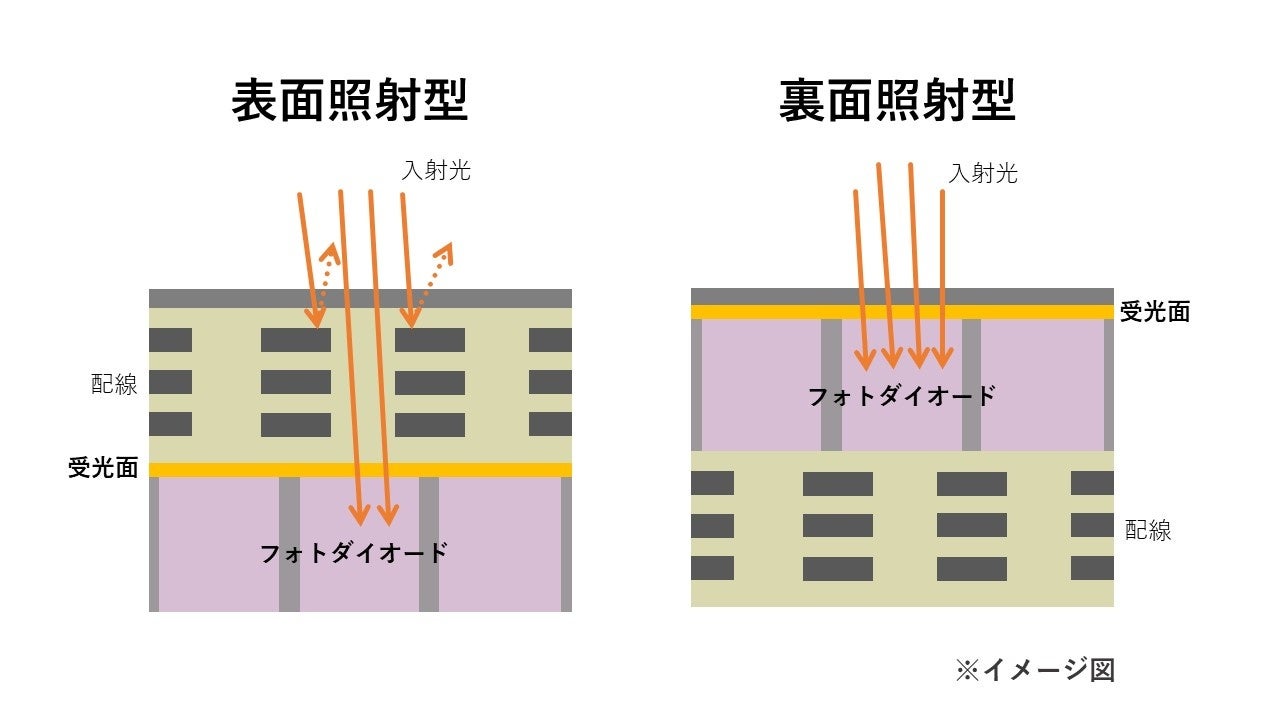従来の表面照射型センサの場合、入射した光が受光面に到達する前に配線層により反射・減衰してしまいます。BSIでは配線層で減衰することなく受光面に光を入射できるため、同じ撮像素子の大きさでもより明るい画像を少ないノイズで取得可能です。