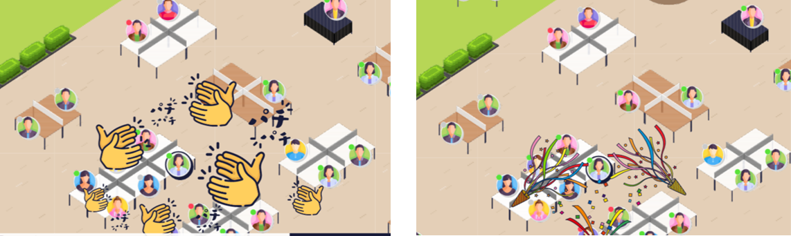 遠方のワーカーも同じ場所にいるような感覚で働けるクラウド上のオフィスで、各スタッフの状況もアイコンですぐに把握できます。オフィスのレイアウトやフロアの設定も管理できるため、「自社のオフィス感」をより感じることができる仕様です。