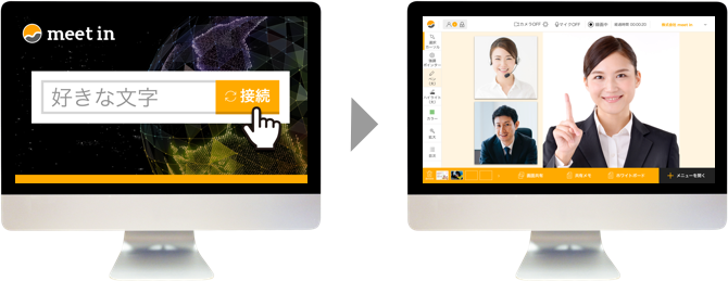 面倒なソフトウェアのインストールやログインなど一切必要なく、好きな文字列でURLを即時発行、ブラウザだけですぐにオンラインミーティングが開始できます。