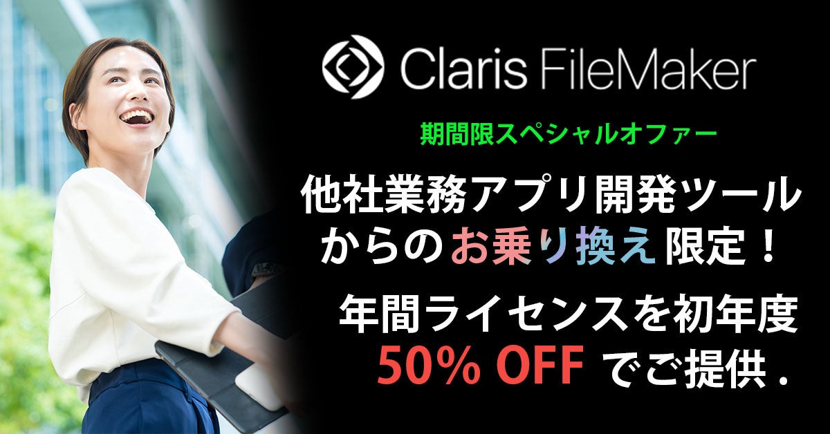 【初年度半額キャンペーン】Claris FileMaker 他社からの乗り換えで 初年度 50% オフで提供開始。