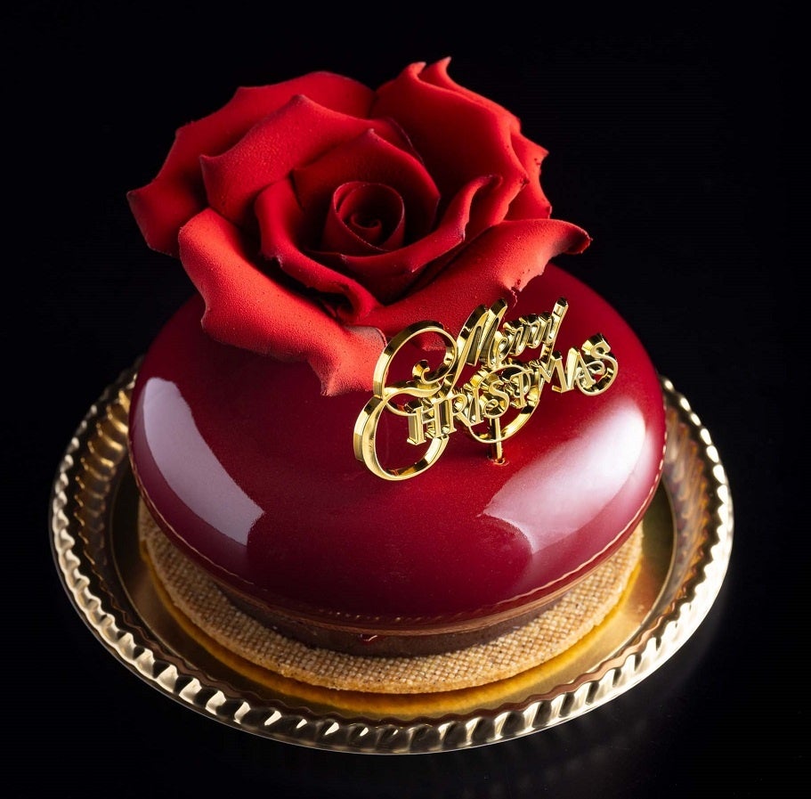 横浜市の花、バラをモチーフにしたケーキは、ラズベリーチョコレートのムースとピスタチオのブリュレの軽やかな味わいに、チョコレート生地とストロベリージャム、アールグレイサブレがアクセントを加える華やかなスイーツ。