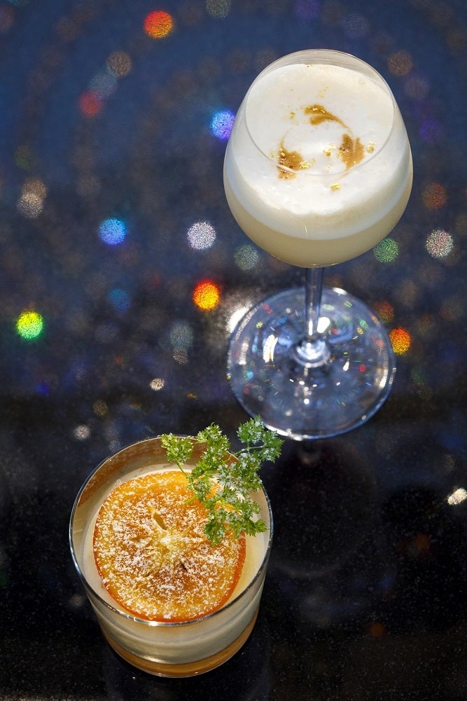独自熟成のプレミアムなダークラムのロンサカパにカカオの風味を加え、ジンフィズの生みの親と言われている「ヘンリー・ラモス」へのオマージュとして捧げる「ラモスカカオフィズ」と、日本の冬をイメージした白を基調に人肌恋しくなる季節に柔らかな味わいが特徴の「スウィートレディ」、白をテーマに冬の季節をイメージしたカクテル2種をご用意いたしました。