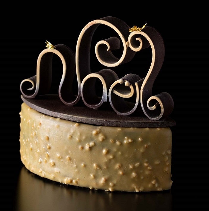 マロンペーストとブラウンシュガーのムースリーヌの中に麦のブランマンジェとラム酒入りの栗のクリームを包み込ませ、表面はナッツ入りのチョコレートでコーティングしました。幾重にも折り重なり合う味のコントラストをお楽しみいただける見た目も華やかなケーキに仕上げました。