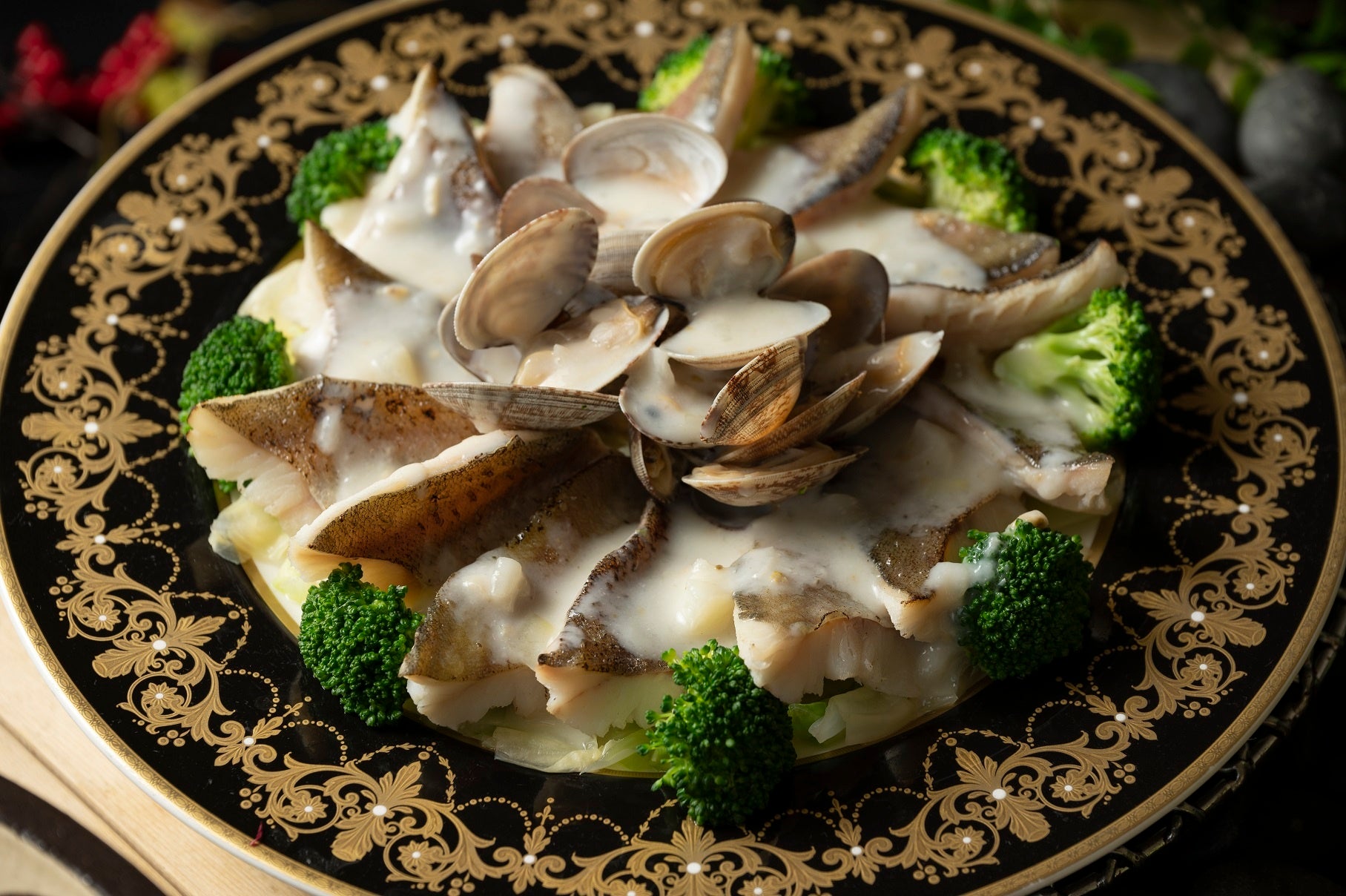 愛知県産ヒラメと乾燥湯葉のにんにく蒸し