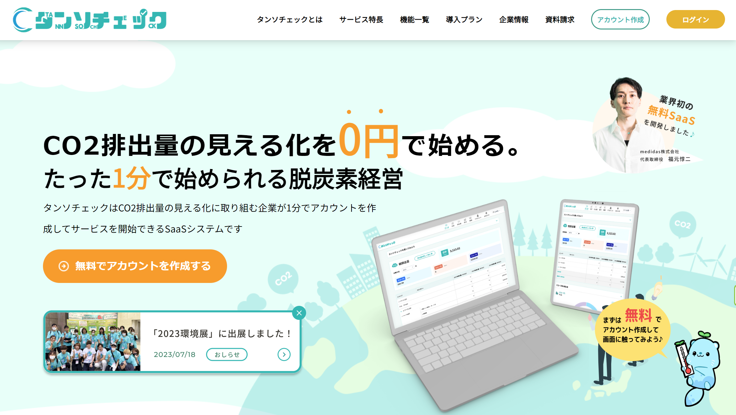 タンソーマンはCO2排出量の削減に向け、ともに新たな一歩を踏み出す企業を募集いたします。CO2排出量の見える化SaaS「タンソチェック」の実証実験の取り組みを開始し、積極的な参加企業を探しています。