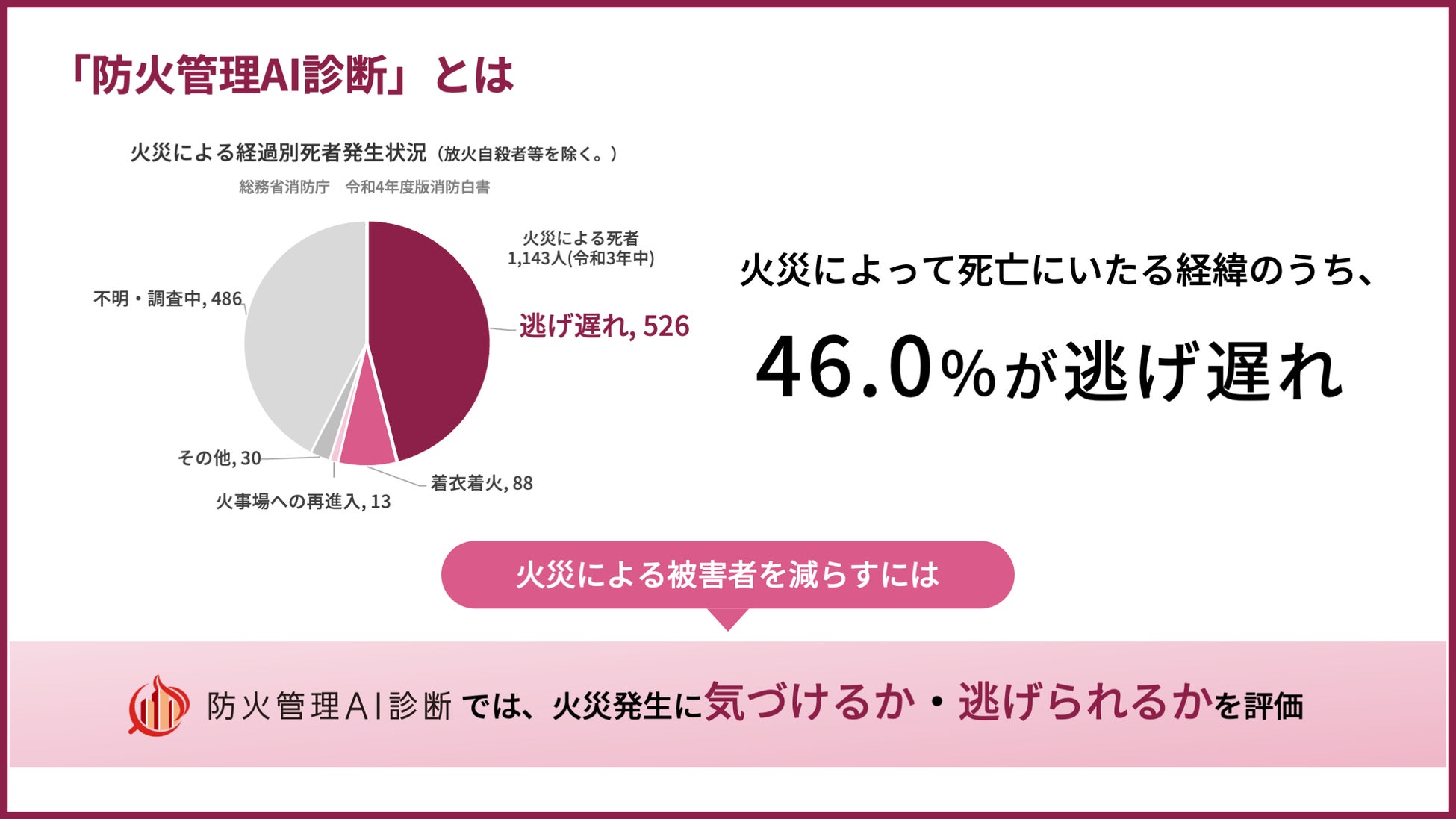 火災によって死亡者が出る経緯として最も多いのは「逃げ遅れ」。火災による死亡者のうち、約46%がこの「逃げ遅れ」によって命を落としています。火災による被害者を減らすため、防火管理AI診断では火災発生に「気づけるか」・「逃げられるか」を評価します。