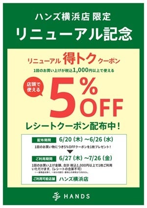 リニューアルオープンを記念して、配布期間にハンズ横浜店でお買い上げいただきましたお客様へ5%OFFクーポンを配布します。