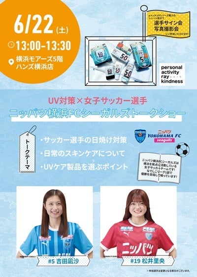 UVスキンケアpark(パーク)シリーズと日本女子サッカーリーグ「ニッパツ横浜FCシーガルズ」がコラボし、選手によるUV対策についてのトークショー、交流会を開催します。 当日parkシリーズをお買い上げのお客様は、選手サイン会・撮影会にご参加いただけます。