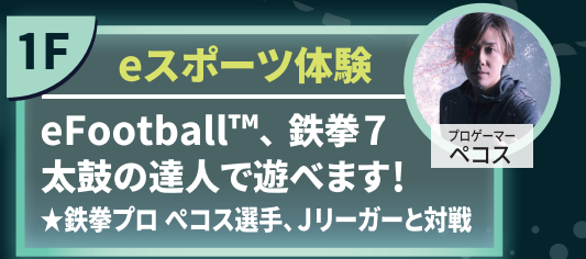 1Fで開催します。プロゲーマーのペコス選手やプロサッカー選手の皆さんと一緒にeスポーツの体験を行えます。