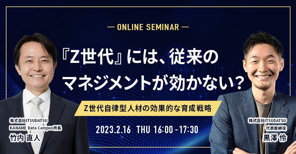 今回のセミナーでは「『Z世代』には従来のマネジメントが効かない?〜Z世代自律型人材の効果的な育成戦略とは〜」をテーマに、多くの企業が抱える課題の解決口となるマネジメント手法やその考え方について公開していきます。