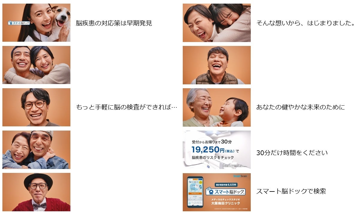 「家族やペットを守りたい」「好きなことをとことん楽しんで過ごしたい」という想いを、様々な人たちの笑顔をつないで伝えるストーリーです。多くの方に健やかな未来を過ごしてほしいという想いが込められた「スマート脳ドック」ブランドを伝えます。