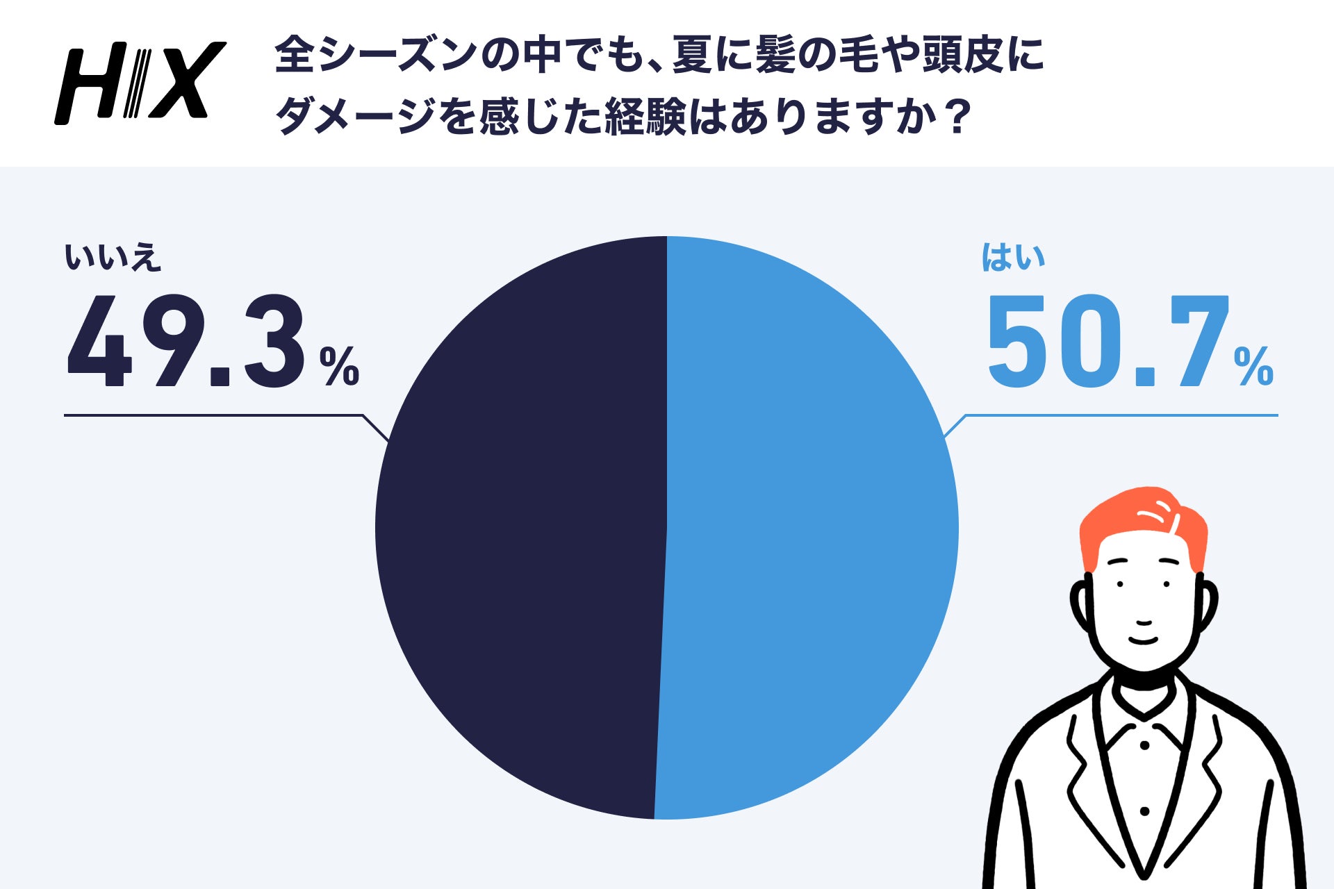 1,全シーズンの中でも、夏に頭皮や髪にダメージを感じた経験があるユーザーは約半数