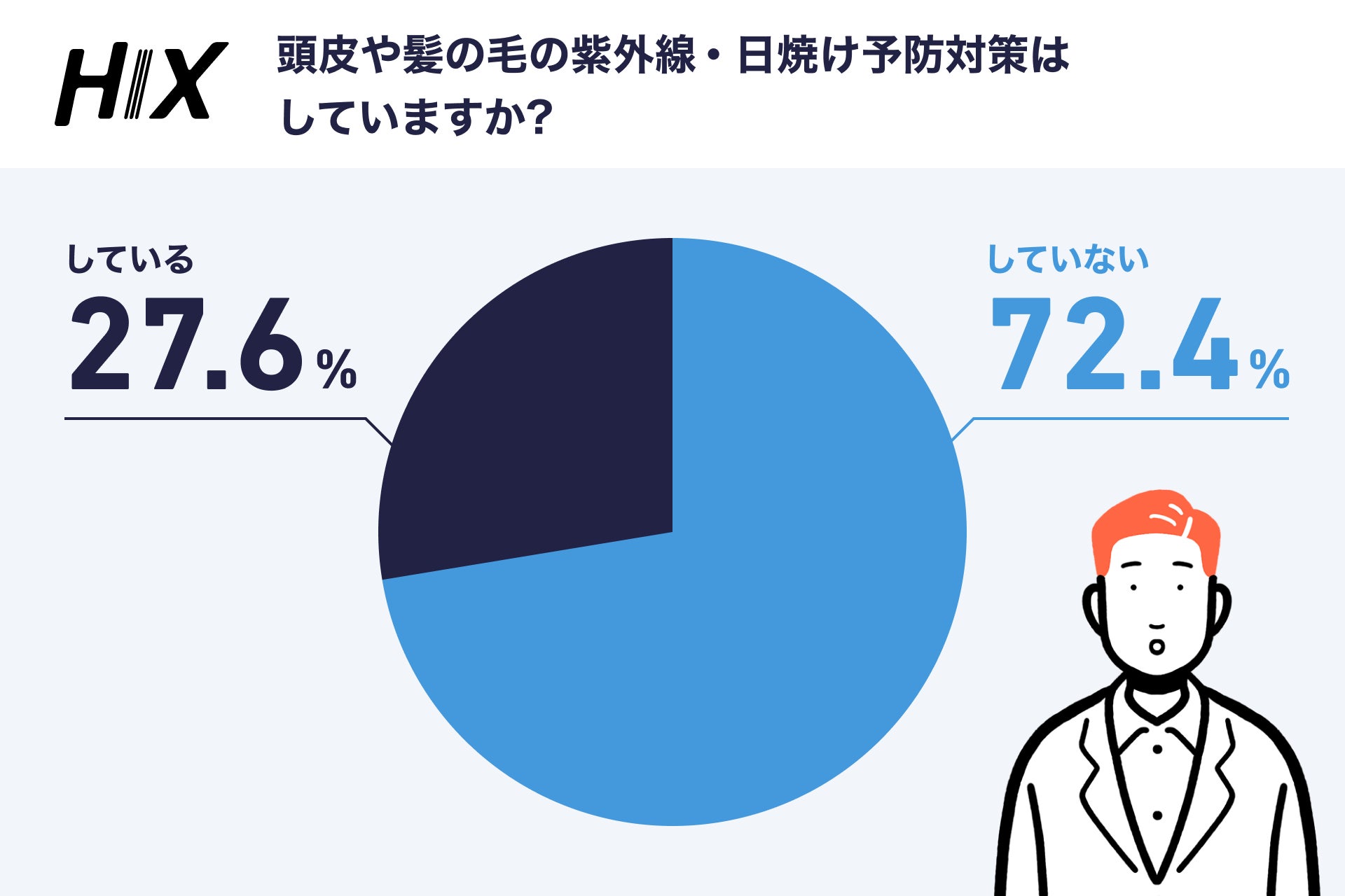 HIXのユーザーの中で、頭皮と髪の紫外線・日焼け予防対策をしている人は、わずか27.6%となりました。頭皮と髪が日焼けをすることを知っているユーザーは67%以上いるにもかかわらず、72%以上のユーザーが特別な対策をしていないようです。
