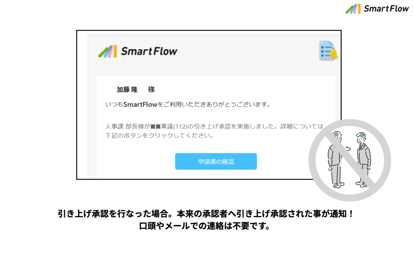 引き上げ承認を行なった場合、スキップされた承認者には引き上げ承認された事が通知されるため、別途口頭・メールで連絡する必要はありません。