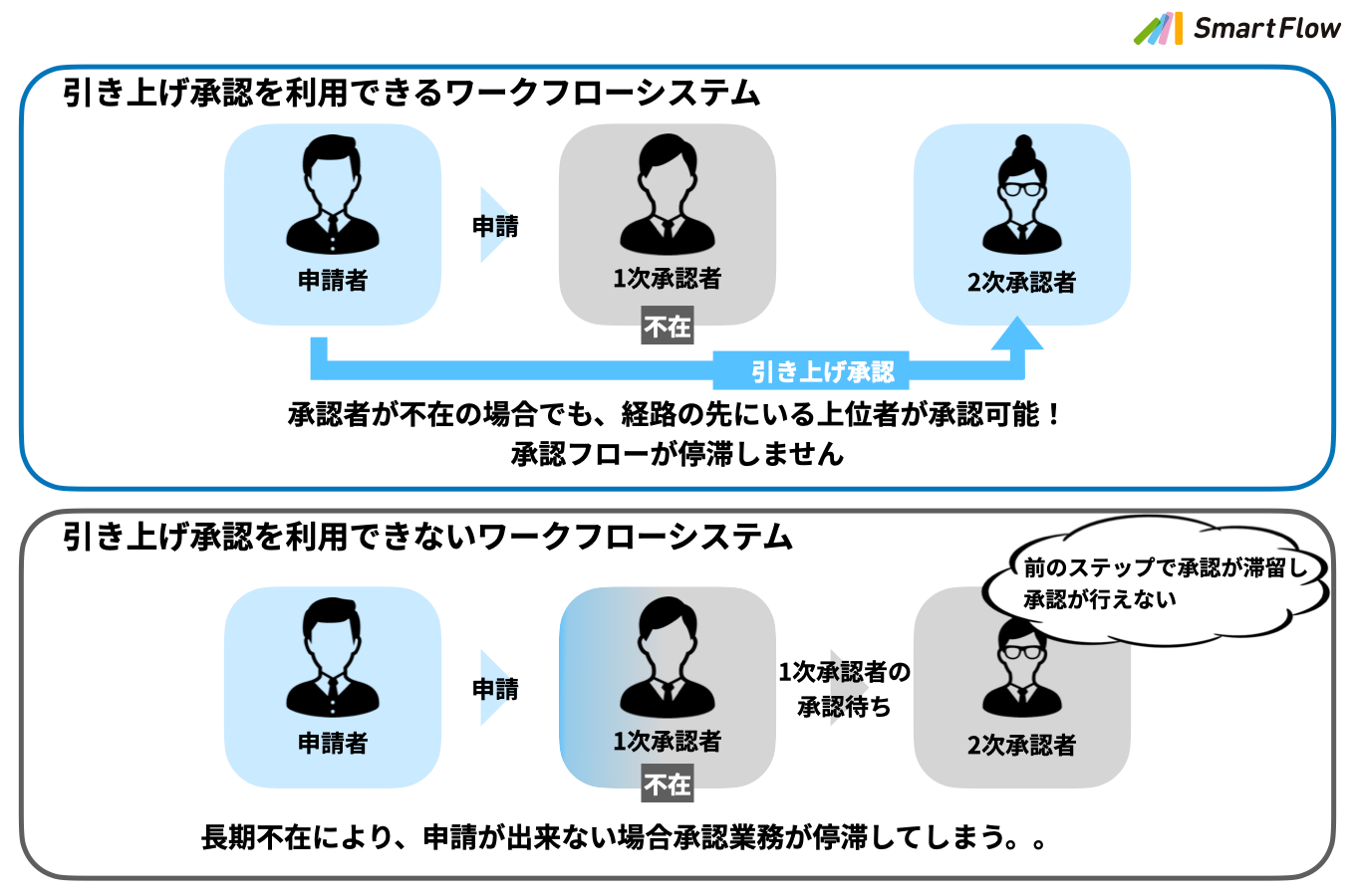 「引き上げ承認機能」とは、承認プロセスが多段階に分かれている場合に、上位の承認者が手前の段階で承認されていなくても、承認プロセスを進めるために手前の段階の承認を引き上げることができる機能です。