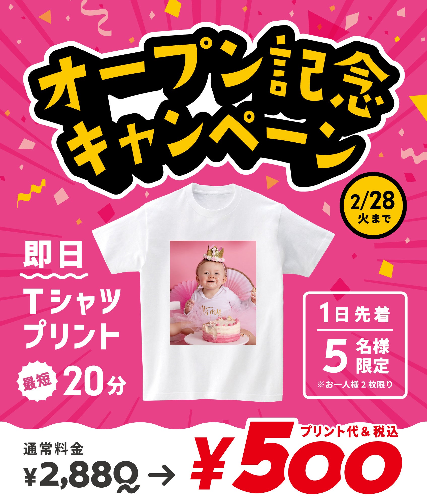 新店舗のオープンを記念して2月6日(月)~2月28日(火)の期間中、【1日5組限定!即日プリント ワンコイン体験キャンペーン】を実施します。1日5組限定で通常2880円のサービスがワンコイン500円で体験いただけます。