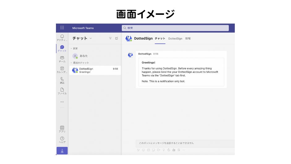 今回のMicrosoft Teamsとの機能連携の最大の目的は、ユーザーがより簡単に電子サインによる契約を行うことができるようになることです。ユーザーは、Microsoft Teamsを使うだけで、契約締結などを含む全ての作業をMicrosoft Teams上で完結させることが可能です。初めてご利用される方は、Microsoft Teamsのアプリメニューでドットサインを検索し、ドットサインへログインすることで、簡単に使うことができます。