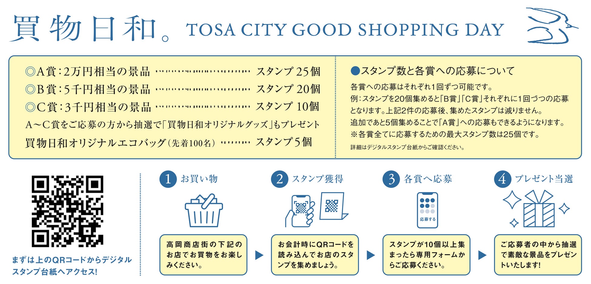 土佐市高岡町の商店街を舞台に、買い物を楽しみながら豪華賞品が当たるデジタルスタンプラリー「買物日和。TOSA CITY GOOD SHOPPING DAY」が、2025年10月26日(日)から12月26日(金)まで開催されます。
