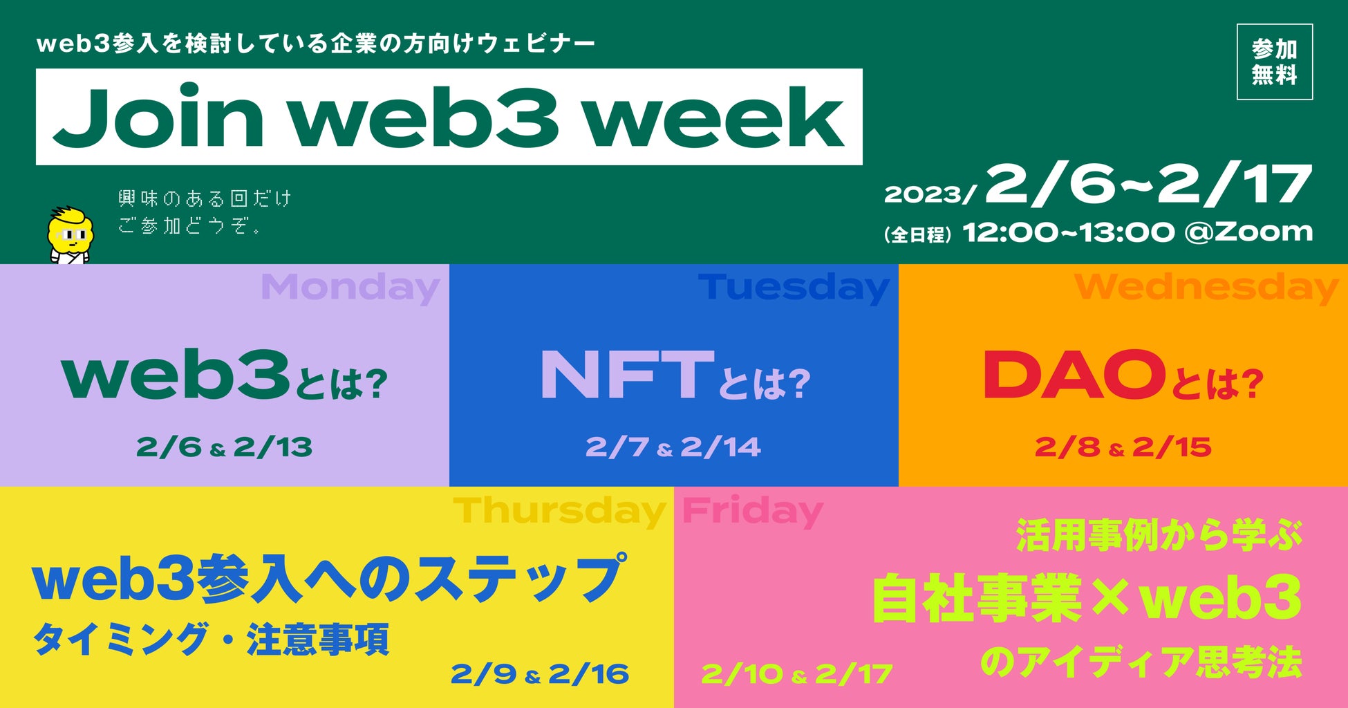 【web3参入を検討している企業へ】web3に関する基礎的な知識のインプットと具体的な参入方法やタイミングを勉強する連続ウェビナー「Join web3 week」を開催!!
