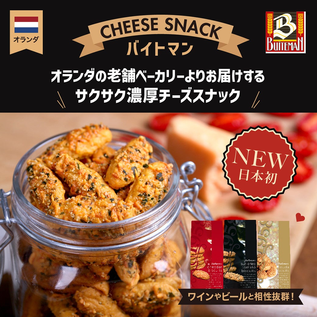株式会社リブインコンフォート(本社:東京都渋谷区千駄ヶ谷/代表取締役社長 恩田ちづる)は、オランダ発のブランド「BUITEMAN(バイトマン)」のチーズスナックを11月28日(火)に発売いたします。1953年創業の老舗ベーカリーで生まれたバイトマンは、ケージフリーの卵で作られたビスケットの上に、英国産の濃厚なナチュラルチーズを贅沢にまぶしたチーズスナックです。生ハムやオリーブを添えておつまみとしてもお楽しみいただけます。オーブンで数分焼くとさらに香ばしくサクサクとした食感で、深い旨みの贅沢な味わいは絶品です。