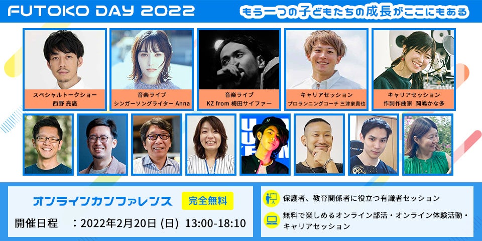 株式会社クラスジャパン学園(所在地: 東京都渋谷区、代表取締役中島 武)は、日本初の不登校のための大規模カンファレンス「FUTOKO DAY 2022 」を2月20日(日)にオンラインで開催致しました。約650名の応募があり、業界問わず、著名人・アーティスト・クリエイター・経営者など99人/社の方にご登壇・ご協力いただきました。カンファレンス中の総チャット数は約850件、98%がポジティブな内容。FUTOKO DAYの開催目的である『もう一つの成長の機会』があることを、共有できた結果となりました。
