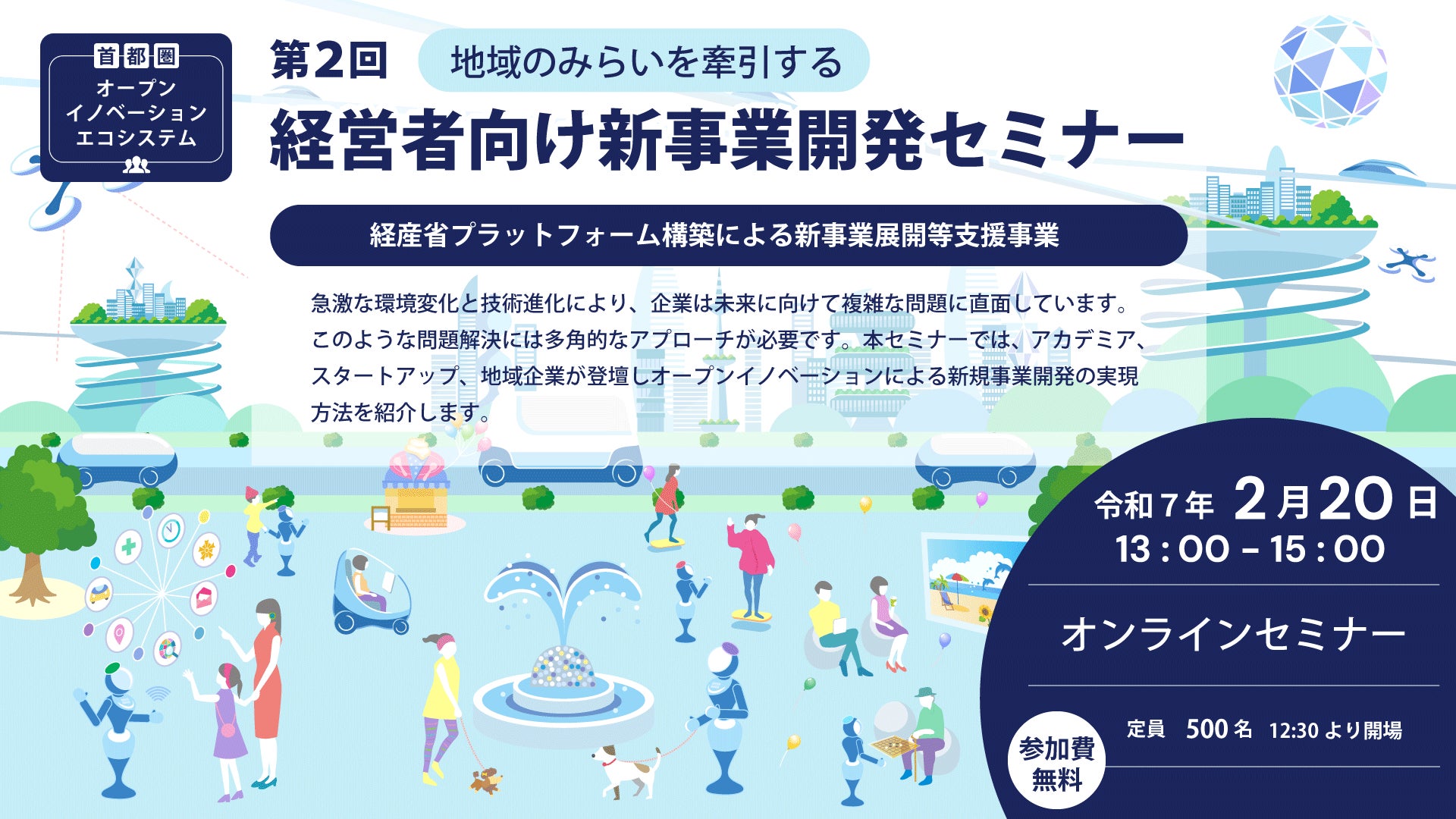 株式会社みらいリレーションズ(本社:東京都大田区、代表取締役社長:齋藤 康平、以下「みらいリレーションズ」)は、首都圏エリアにおける新事業開発を支援する「第2回 地域のみらいを牽引する経営者向け新事業開発セミナー」を開催いたします。本イベントは、経済産業省「プラットフォーム構築による新事業展開等支援事業」の一環として実施され、首都圏エリア(埼玉県、千葉県、東京都)の中堅・中核企業の経営者様に首都圏オープンイノベーションエコシステムの活動紹介および、伴走支援の具体的な取り組みを紹介します。地域の未来をリードする経営者の皆様に向けて、新たなビジネスチャンスを提供する場を創出します。