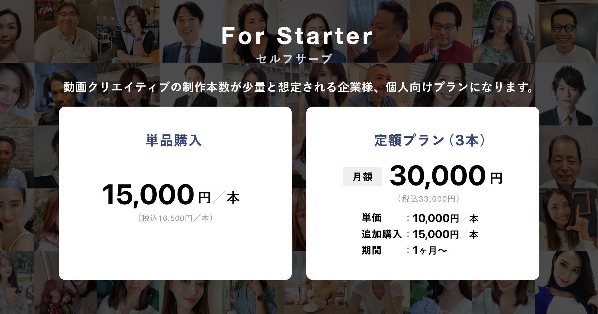 これまでは、動画素材の収集に加え、導入企業のカスタマーサクセスやオーダー撮影込みで月額15万円(税込16.5万円)以上のプランのみを提供しておりましたが、動画クリエイティブの制作本数が少量の企業やアドアフィリエイターなど個人の方からもDeLMOを活用したいという声をいただく機会が増えてきましたので、この度、単品購入1.5万円(税込16,500円)と月3本までダウンロード可能な月額3万円(税込33,000円)のセルフサーブの2つの新プランをリリースいたしました。