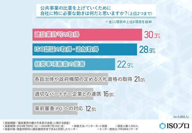 「公共事業の比重を上げていくために自社に特に必要な動きは何だと思いますか?(上位2つまで)」と質問したところ、『建設業許可の取得(30.3%)』と回答した方が最も多く、『ISO認証の取得・追加取得(28.9%)』『経営事項審査の受審(22.9%)』と続きました。