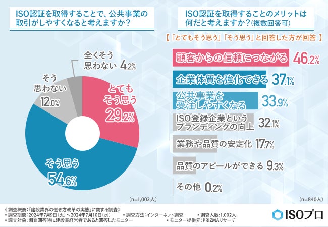 そして、8割以上の方が公共事業の案件を増やすことは従業員の満足度の向上につながると考えており、公共事業の案件を増やすためにはISO認証の取得が必要と考えていることが明らかになりました。