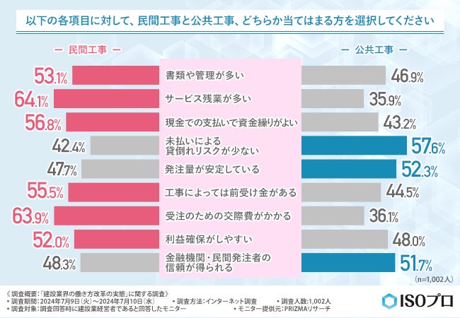 そこで、「以下の各項目に対して、民間工事と公共工事、どちらか当てはまる方を選択してください」と質問したところ、以下のような回答結果になりました。