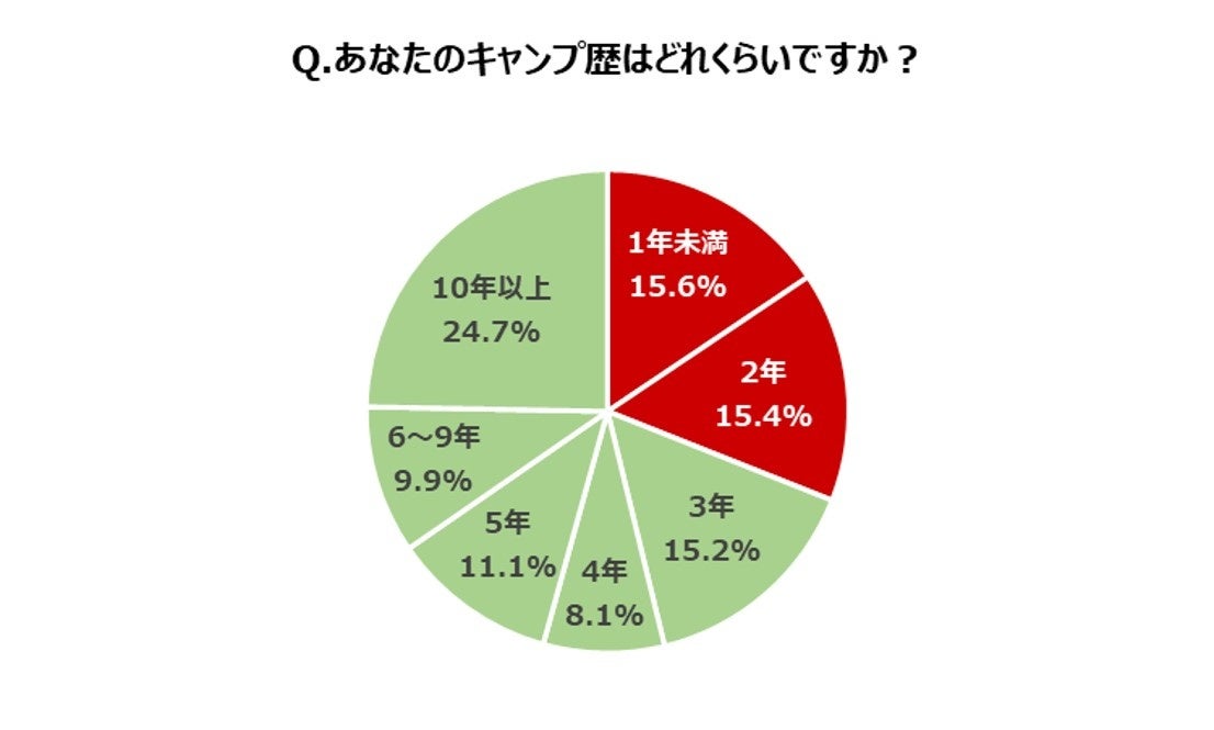 2021年に1回以上キャンプをしたと回答した83.6%の人に、「キャンプ歴」を聞いたところ、1年未満(2021年にキャンプをスタート)と回答した人が15.6%と、キャンプ歴が2年(2020年にキャンプをスタート)と回答した人よりも多い結果となりました。さらに、2020年、2021年にキャンプをスタートした人の合計は31%で、約3人に1人がコロナ禍にキャンプを始めており、ここ2年で新規のキャンプ人口が増加していることが分かりました。