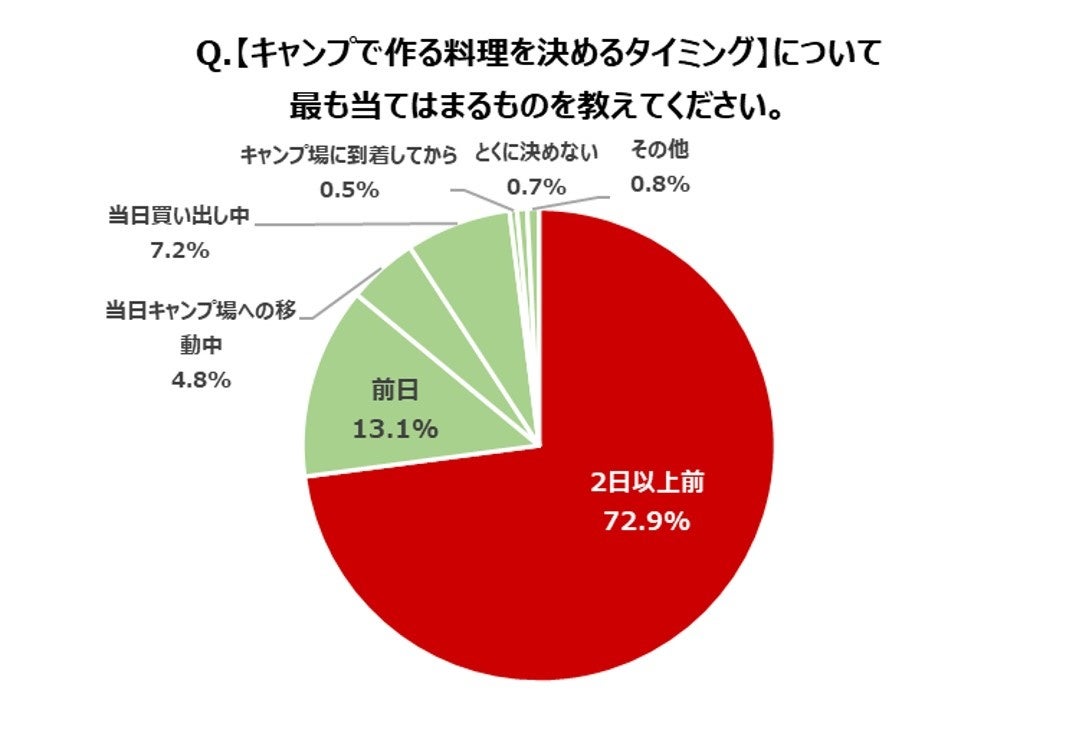 「キャンプで作る料理(特に作りたい一品)を決めるタイミング」を聞くと、72.9%もの人が2日以上前から考えていると回答しました。「前日」までに決めるという人を含めると、86%の人が事前にメニューを考えていることが分かります。キャンプの日を楽しみにしている姿が想像でき、早めにメニューを決めることで、準備を入念に済ませていることが推察できます。