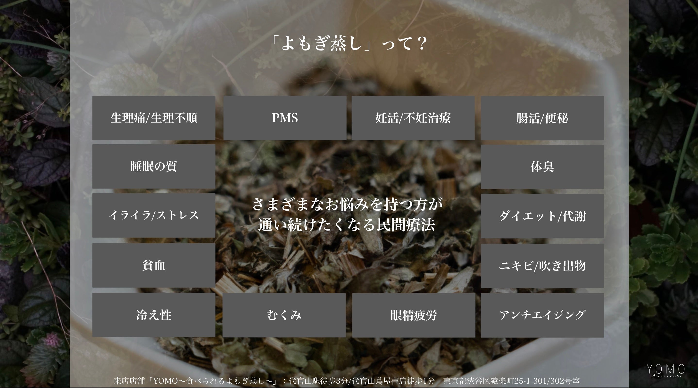 店舗名 | YOMO~食べられるよもぎ蒸し~ |