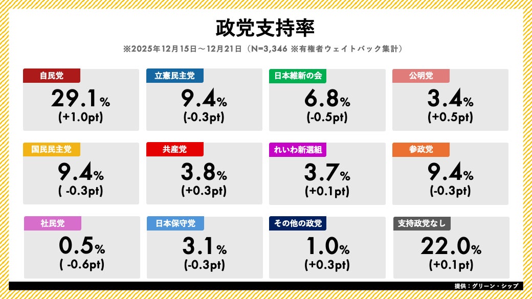 ジャッグジャパン株式会社(本社:東京都渋谷区)は、株式会社グリーン・シップ(本社:東京都千代田区)と業務提携し、グリーン・シップが提供する日次世論調査「世論レーダー」のデータを提供しております。本日、2025年12月第3週(12月15日〜21日)の内閣支持率・政党支持率調査の結果を発表いたします。また、詳細レポートPDFを「世論レーダー」公式サイトの週次ページで1,980円(税込)で販売開始しました。