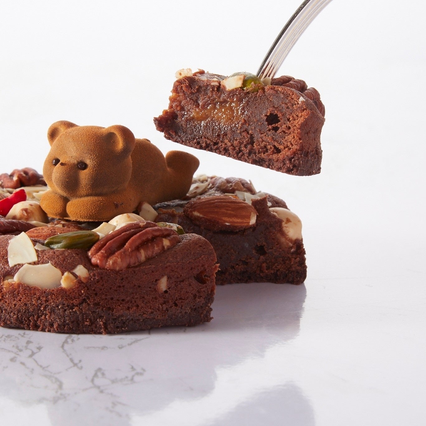 バレンタインコレクションでお披露目の大人気ケーキ。土台のケーキは2004年クーベルチュール世界1位を獲得したMaracaibo65を使用したチョコレートブラウニー。飾りにはアーモンド、くるみ、ピスタチオ、ヘーゼルナッツ、ピーカンナッツの5種をふんだんに使用し、様々な食感をお楽しみいただけます。中にはキャラメルチョコレートのガナッシュが入っており、少し温めると中からトロリと出てくるサプライズ。お召し上がり方はお好みでお選びいただけます。¥4,536(税込)テイクアウト/EC予約可能
