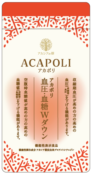 「アカポリ血圧・血糖Wダウン」は、機能性関与成分として独自成分「アカシア樹皮由来プロアントシアニジン」が配合され、収縮期血圧が高めの方の高めの血圧(収縮期血圧)を下げる機能、空腹時血糖値が高めの方の高めの血糖値(空腹時血糖値)を下げる機能があります。
