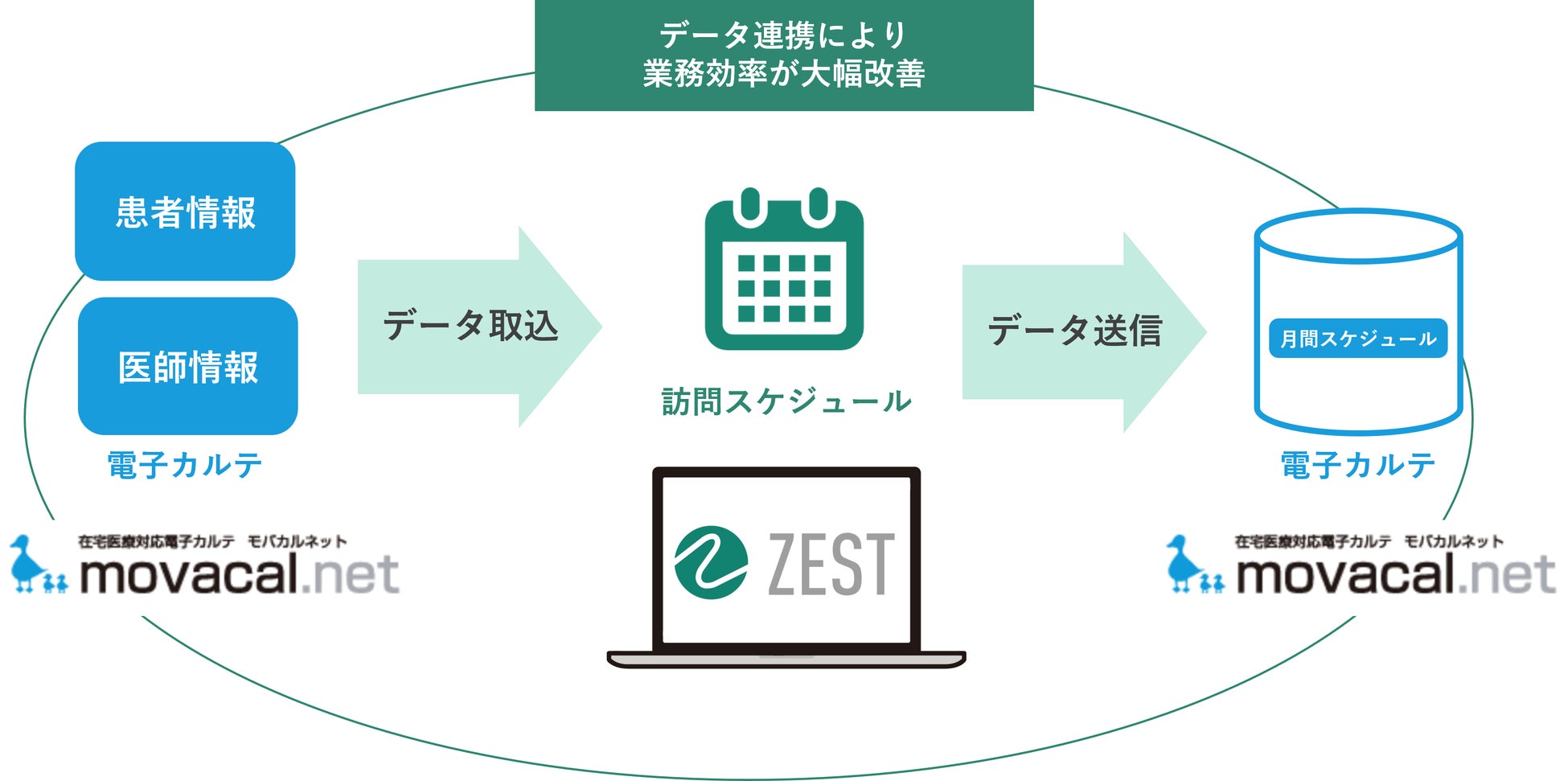 在宅医療・介護の訪問スケジュール自動作成ツール『ZEST』を展開する株式会社ゼスト(本社:東京都千代田区、代表取締役社長:一色淳之介)は、在宅医療対応電子カルテ『movacal.net』(以下、「モバカル」)とAPI連携を実現いたしました。