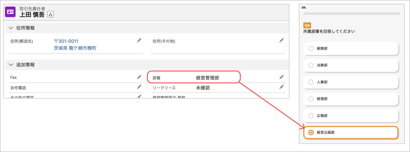 Salesforceの顧客データに登録している項目を参照してアンケート回答画面にデフォルト値として表示できます。