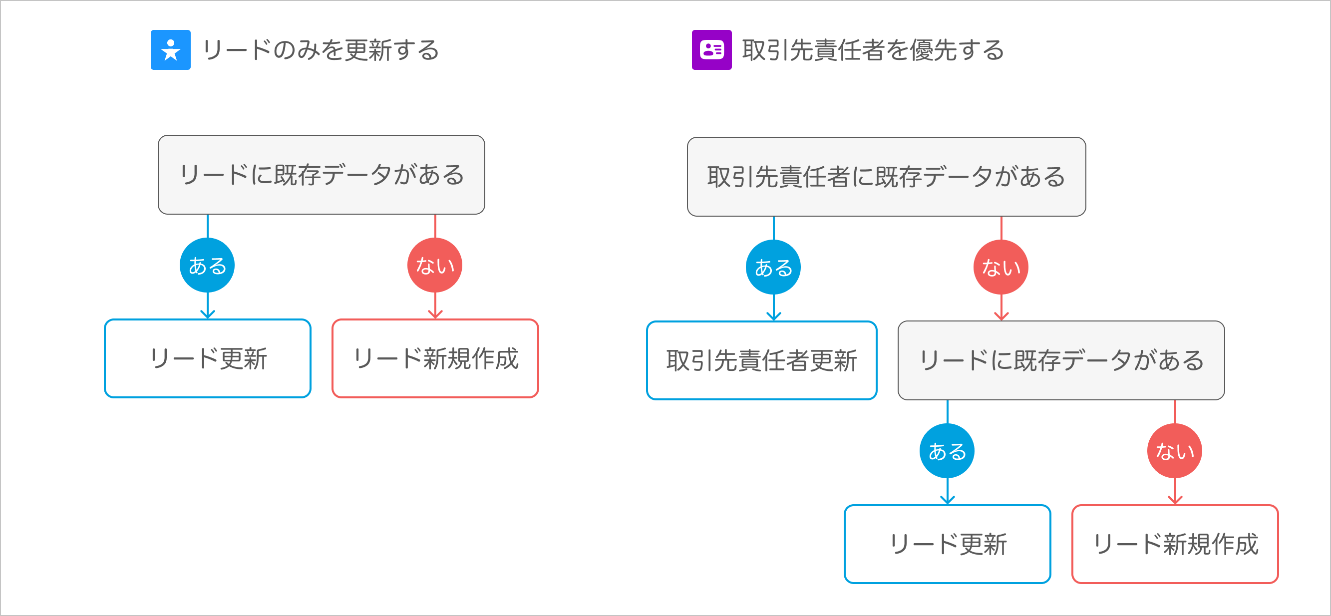 「リード」または「取引先責任者」への更新は「メールアドレス」または「ID」を照合します。