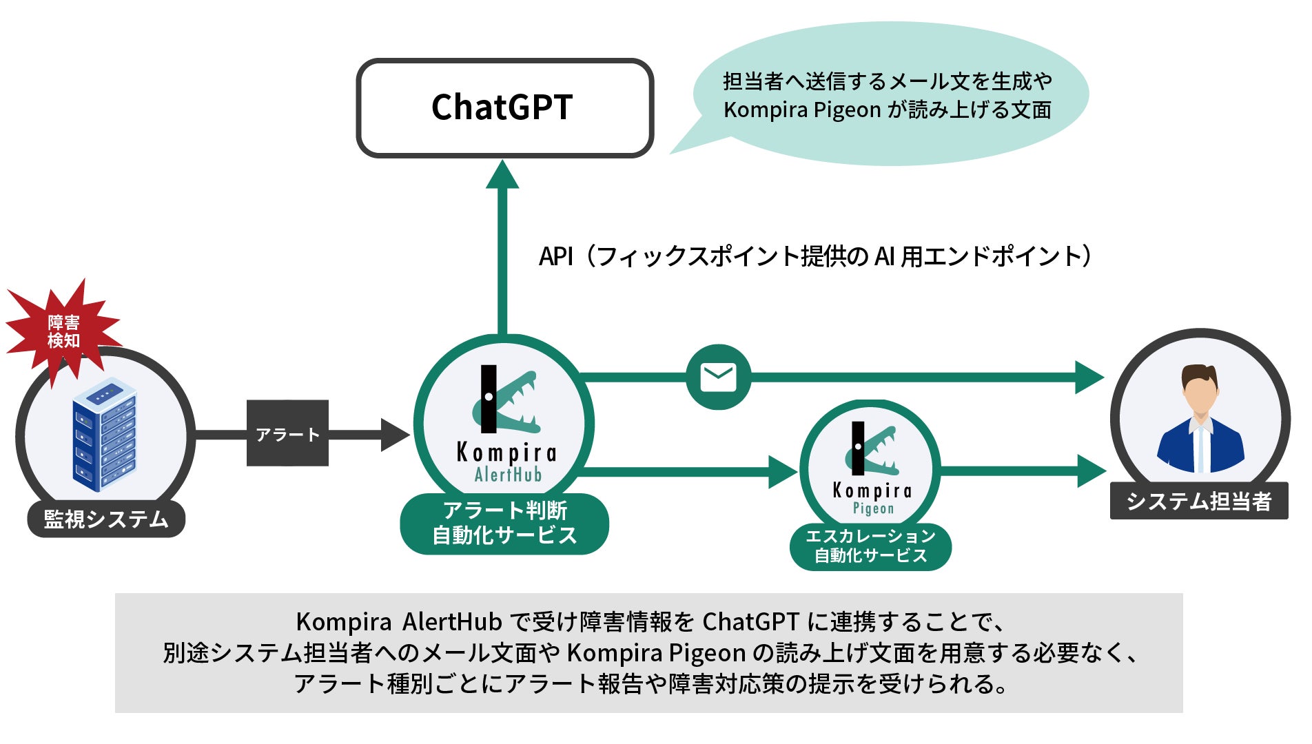 ■概要:監視システムからのアラートを「Kompira AlertHub」で受け、アラート内容をChatGPTへ連携。ChatGPT内でシステム担当者への連絡メール文面用にアラート内容を元に障害の詳細や原因・対応策を生成し、更に「Kompira Pigeon」で読み上げるための文面を生成。