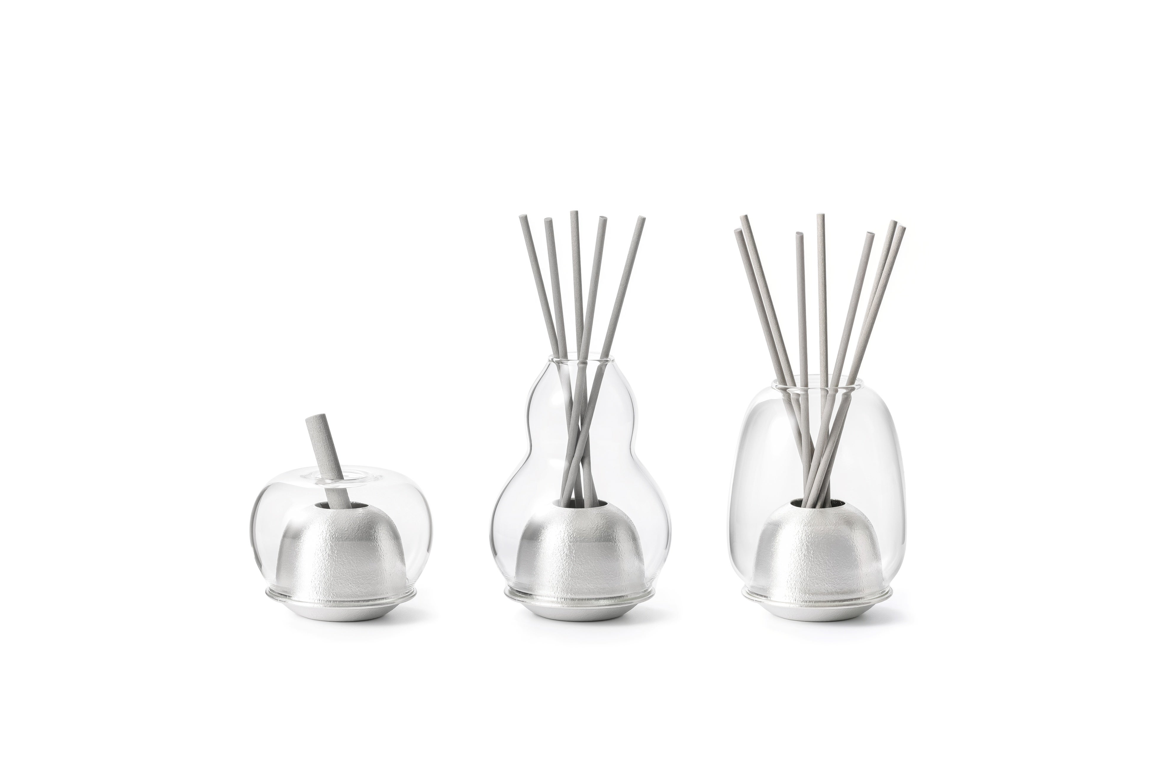スティックを入れる錫100%製のポットは、当社の伝統技術による職人の手作り品です。台湾で幸運の象徴である「りんご(平安)」「ひょうたん(幸福)」「パイナップル(繁栄)」をデザインしたガラスをセットして使用します。
