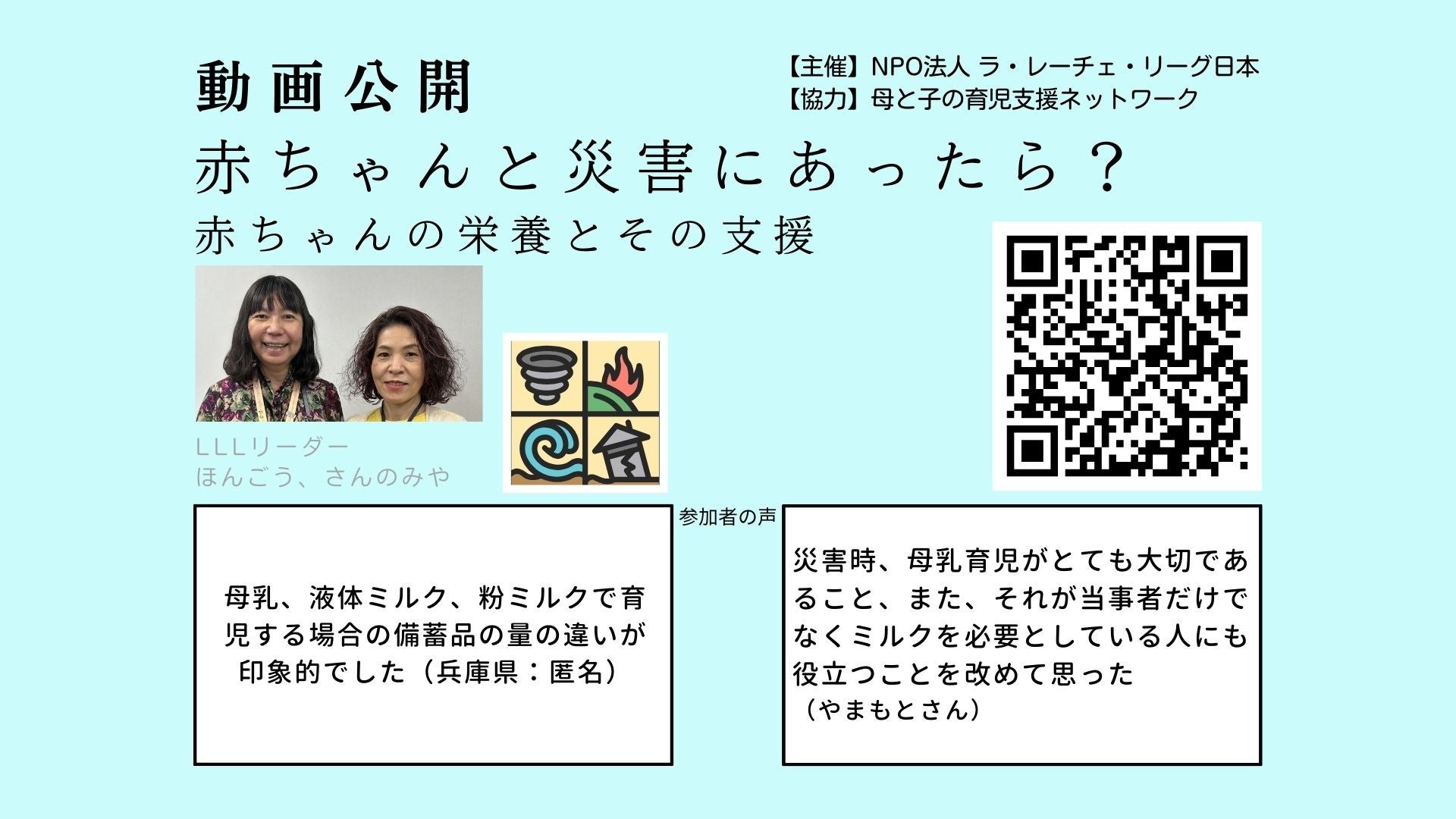 NPO法人ラ・レーチェ・リーグ日本(大阪府四條畷市、代表理事:飯村ひとみ)は、2024年8月4日にzoom webinar で母と子の育児支援ネットワークの協力のもと開催された「赤ちゃんと災害にあったら?」の動画を公開しました。