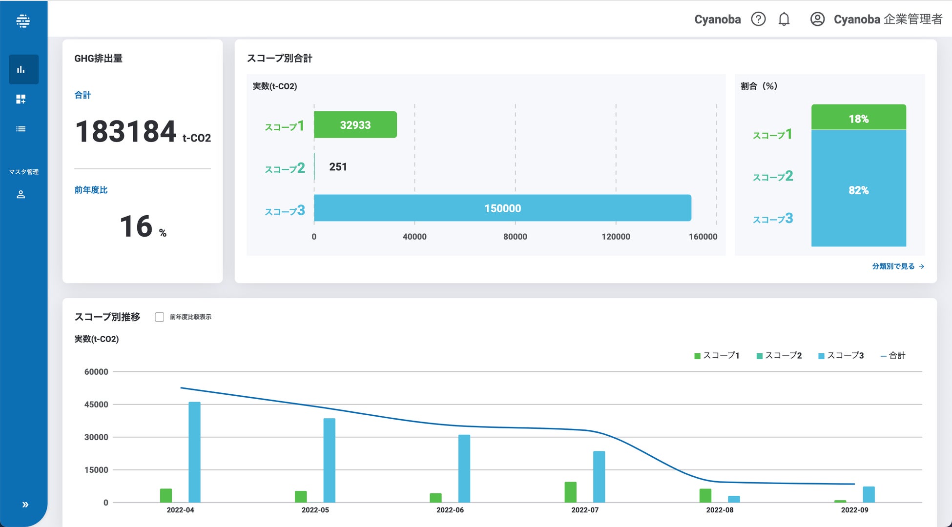 Cyanoba(シアノバ)は、脱炭素社会実現に向けた全企業及びその取引先、プライム上場企業並びにCO2削減支援業務を行うコンサルティング会社向けグリーントランスフォーメーション(GX)SaaSです。2050年の脱炭素社会の実現に向けて、GXへの取り組みが求められる中、「経済性」と「CO2排出量をゼロ」の両立を実現するために必要な機能を備えております。CO2の見える化だけでなく、CO2のサプライチェーン排出量の算定・削減に向けた対策の検討・GX戦略ロードマップの作成等を支援するGXマネジメントツールです。