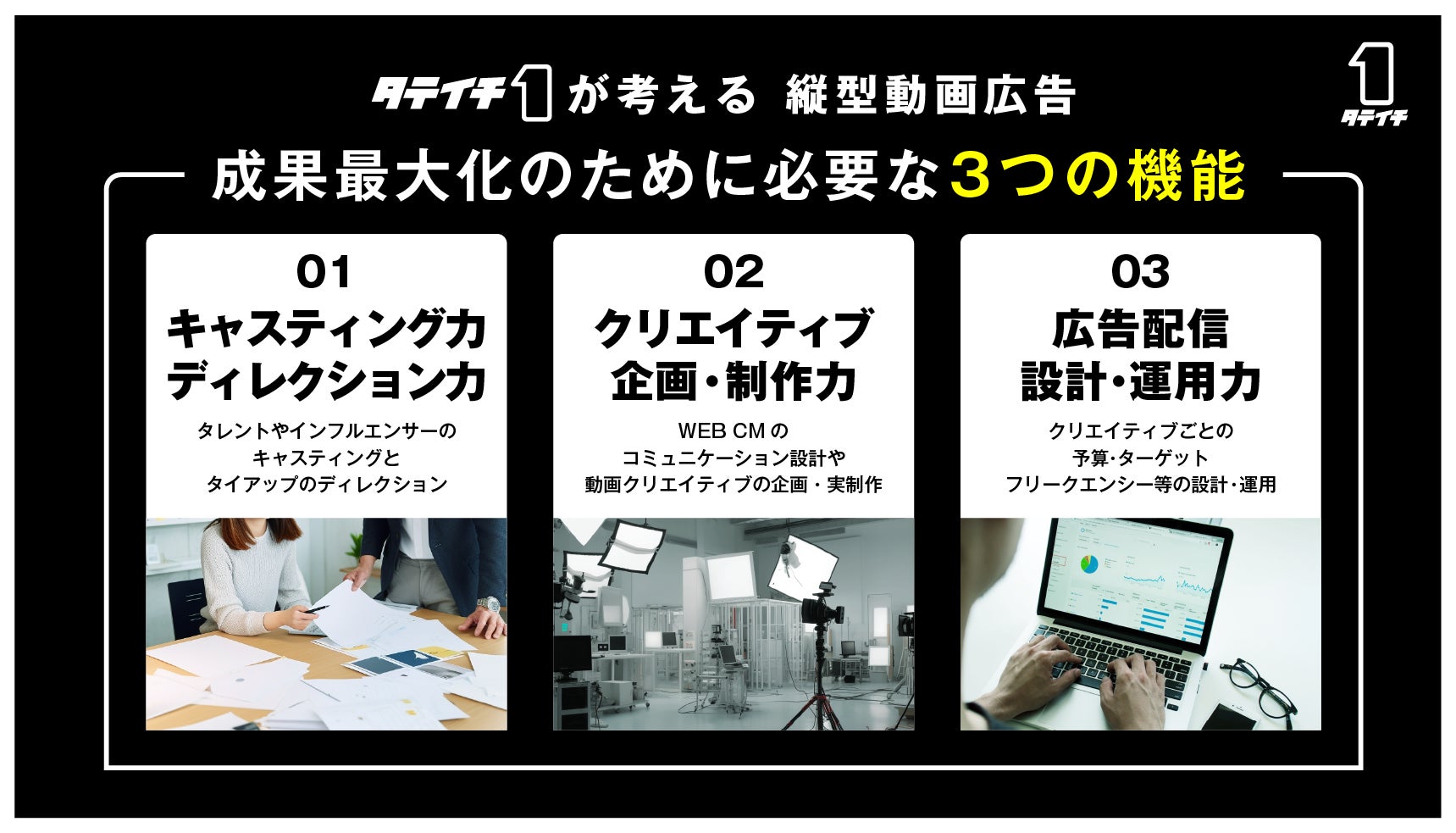 これら3つの要素ーキャスティング力・ディレクション力、クリエイティブ企画・制作力、広告配信設計・運用力において、縦型動画コンサルティングスタジオ「タテイチ」では、これらすべてに特化していると自負しています。この理由としては、社内にクリエイティブディレクター、ストラテジックプランナー、プロデューサー、メディアコンサルタントなど様々なプロフェッショナルが揃っており、一気通貫した動画広告の制作が可能となっているためです。